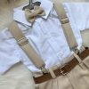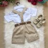 Este conjunto social infantil é a escolha perfeita para deixar os pequenos elegantes e confortáveis em eventos como casamentos, batizados, aniversários, formaturas e cerimônias em geral. Com um visual sofisticado, ele é ideal para quem busca estilo com praticidade. Detalhes do Produto: Camisa social branca de manga curta, confeccionada em microfibra 100% poliéster, com toque macio e caimento leve. Short preto em twill 100% poliéster, com acabamento moderno na barra dobrada. Acompanha gravata borboleta bege, suspensório bege com regulagem e cinto ajustável marrom com fivela metálica. Itens Inclusos:CamisaShortGravata borboletaSuspensórioCinto Calçado não incluso – vendido separadamente. Disponivel em nosso site na categoria calçados meninosAs tonalidades das peças podem variar de acordo com as configurações de tela do seu dispositivo.Para garantir o ajuste ideal, consulte sempre a nossa tabela de medidas antes de finalizar a compra. As medidas podem apresentar pequenas variações conforme o lote de fabricação.