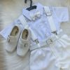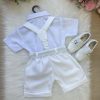 Este conjunto social infantil é a escolha perfeita para deixar os pequenos elegantes e confortáveis em eventos como casamentos, batizados, aniversários, formaturas e cerimônias em geral. Com um visual sofisticado, ele é ideal para quem busca estilo com praticidade. Detalhes do Produto: Camisa social branca de manga curta, confeccionada em microfibra 100% poliéster, com toque macio e caimento leve. Short preto em twill 100% poliéster, com acabamento moderno na barra dobrada. Acompanha gravata borboleta branco, suspensório branco com regulagem e cinto ajustável branco com fivela metálica. Itens Inclusos:CamisaShortGravata borboletaSuspensórioCinto Calçado não incluso – vendido separadamente. Disponivel em nosso site na categoria calçados meninosAs tonalidades das peças podem variar de acordo com as configurações de tela do seu dispositivo.Para garantir o ajuste ideal, consulte sempre a nossa tabela de medidas antes de finalizar a compra. As medidas podem apresentar pequenas variações conforme o lote de fabricação.