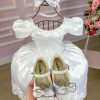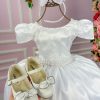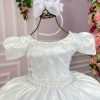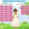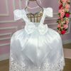 Encante-se com este vestido infantil Dani de festa no tom branco, desenvolvido para transformar qualquer ocasião em um momento inesquecível. Um modelo sofisticado, com detalhes luxuosos e acabamento impecável, ideal para aniversários, casamentos, daminhas, batizados e festas especiais.Detalhes do Produto: Cor: Branco Tecido: Acetinado com sobreposição de tule 100% poliester Busto: Bordado floral delicado com aplicação de pérolas no decote e nas mangas bufantes Cintura: Marcada por um cinto de pérolas com laço fixo nas costas Saia: Ampla e rodada, com camadas volumosas de tule e renda bordada no barrado Mangas: Curtas, trazendo romantismo ao visual. Indicado Para: Daminhas de casamento Festas de aniversário Batizados e cerimônias religiosas Sessões de fotos e ocasiões formais Informações Importantes As medidas podem variar em até 2cm. Recomendamos sempre consultar a tabela de medidas antes da compra para evitar erros. Para um volume extra, indicamos o uso de saiote de armação, vendido separadamente na categoria Acessórios. Tiara e outros acessórios não acompanham o produto, mas estão disponíveis em nosso site. Calçado vendido separadamente, disponível na categoria Calçados As cores do produto podem sofrer variações de tonalidade conforme a configuração da tela do seu dispositivo. Não lavar em máquina, Limpeza a seco recomendada.