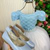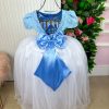 Essa coleção foi criada para transformar cada momento especial em um verdadeiro conto de fadas. Os vestidos combinam a intensidade azul bebe com a pureza e delicadeza do branco neve, resultando em peças que esbanjam charme, romantismo e sofisticação. Detalhes do Vestido Corpo em renda azul bebe com mangas curtas, trazendo um ar clássico e elegante. Saia ampla em camadas de tule branco, que garante volume e movimento delicado. Cintura marcada com cinto em pérolas, acrescentando brilho e sofisticação. Tecido 100% poliester.Perfeita para: Festas de fim de ano (Natal e Réveillon); Batizados e celebrações religiosas; Aniversários temáticos; Ensaios fotográficos e ocasiões especiais.   Uma coleção que une tradição e delicadeza, ideal para quem busca um visual atemporal, romântico e inesquecível para as pequenas princesas.  Informações Importantes As medidas podem variar em até 2cm. Recomendamos sempre consultar a tabela de medidas antes da compra para evitar erros. Para um volume extra, indicamos o uso de saiote de armação, vendido separadamente na categoria Acessórios. Tiara e outros acessórios não acompanham o produto, mas estão disponíveis em nosso site. Calçado vendido separadamente, disponível na categoria Calçados As cores do produto podem sofrer variações de tonalidade conforme a configuração da tela do seu dispositivo.