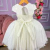 Confeccionado em tecido misto possui forro em poliéster e algodão para não machucar a criança e proporcionando um caimento incrível e sofisticado, possui gola redonda, comprimento médio, mangas curtas, possui elástico nas costas para melhor ajuste, acabamento com lindo laço na parte posterior do vestido completa o look dos sonhos! * Medidas podem variar em até 4cm * Caso queira o vestido mais armado, recomendamos o uso do saiote ou anágua de armação, disponível no nosso site na categoria acessórios. * Tiara vendida separadamente, disponível em nosso site na categoria acessórios.