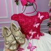 Confeccionado em tecido misto possui forro em poliéster e algodão para não incomodar a criança e proporcionando um caimento incrível e sofisticado, possui gola redonda, comprimento médio, mangas curtas, apliques de Renda e Borboletas, contém, também, elástico nas costas para melhor ajuste, acabamento com lindo laço na parte posterior do vestido completa o look dos sonhos! * Medidas podem variar em até 4cm. * Caso queira o vestido mais armado, recomendamos o uso do saiote ou anágua de armação, disponível no nosso site na categoria acessórios. * Tiara vendida separadamente, disponível em nosso site na categoria acessórios. * Calçados vendido separadamente, disponível em nosso site na categoria calçados. * LEMBRANDO QUE PODERA HAVER VARIAÇÃO DE TONALIDADE DO PRODUTO DEPENDENDO DA TELA DO SEU DISPOSITIVO